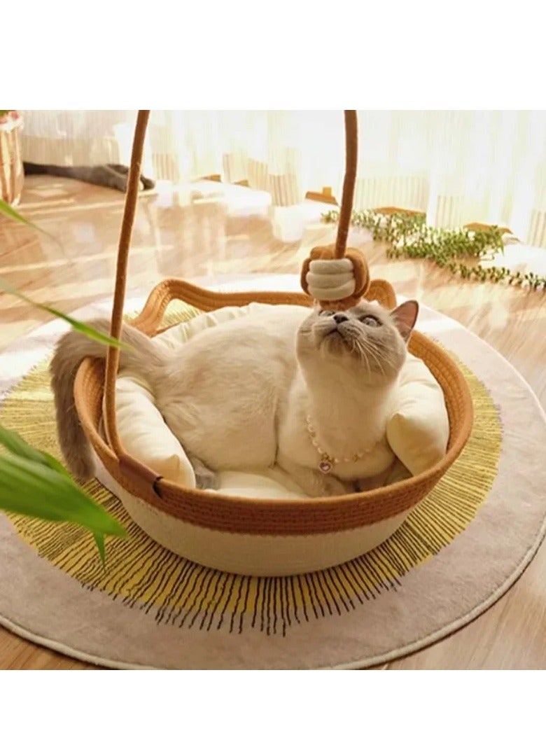 Handwoven Cotton Rope Cat Bed Cat Hammock Foldable Sleeping Nest Basket Handmade Natural Cradle Scratcher Cuddler for Kitten Cute Style with a Playing Rope Ball