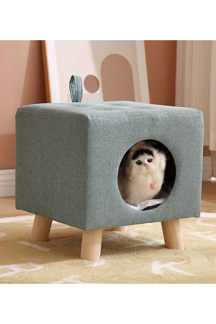 Square Cat Bed Stool with Solid Wood Legs, Multipurpose Pet House/Cat Hideaway, Kittens Nest Used as Foot Stool/Footrest, Easy to Move